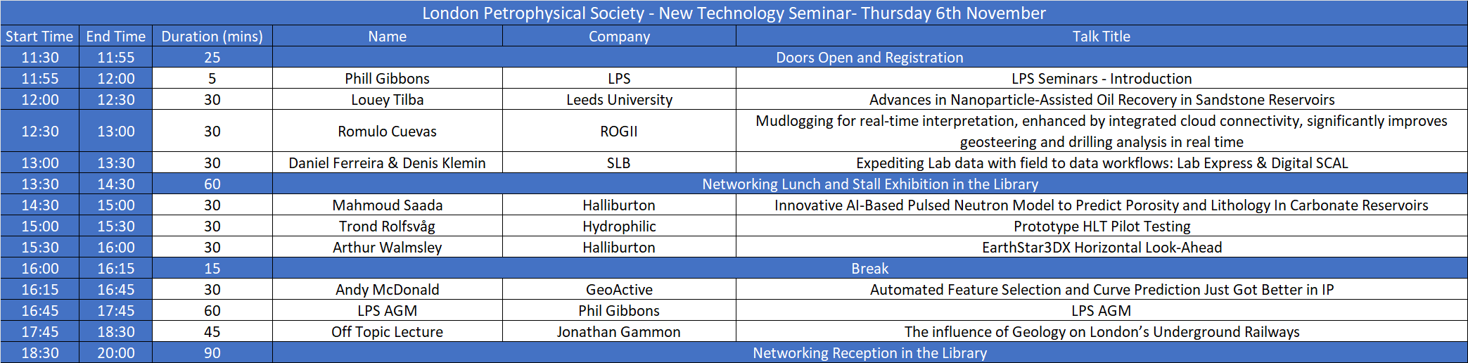 On Thursday 6 November the London Petrophysical Society will be holding our annual New Technology Seminar and Exhibition followed by our AGM and off topic lecture.